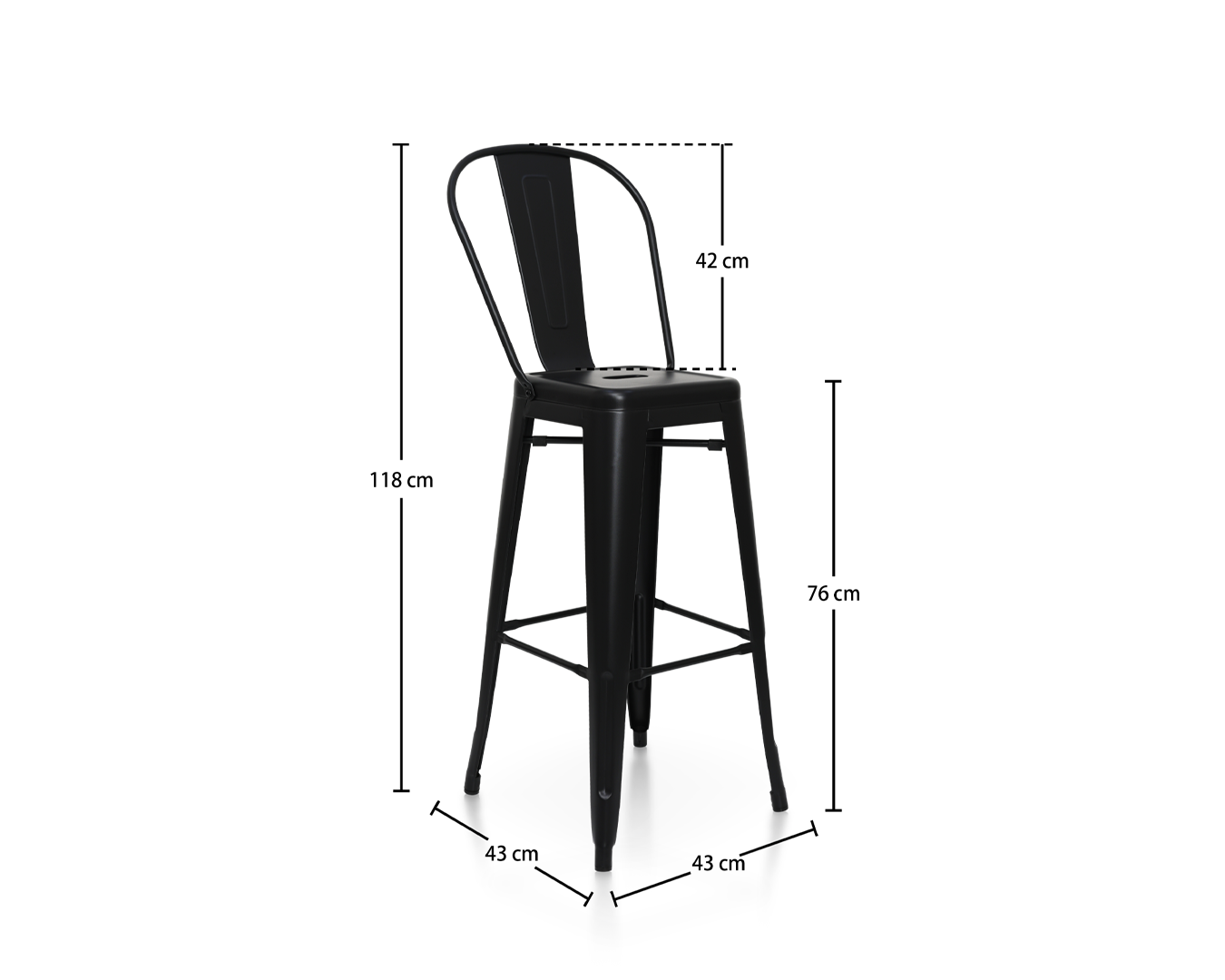 • バックレストを備えたこのブラックメタルバースツールは、独特のミニマリストでありながら工業デザインを特徴としています。