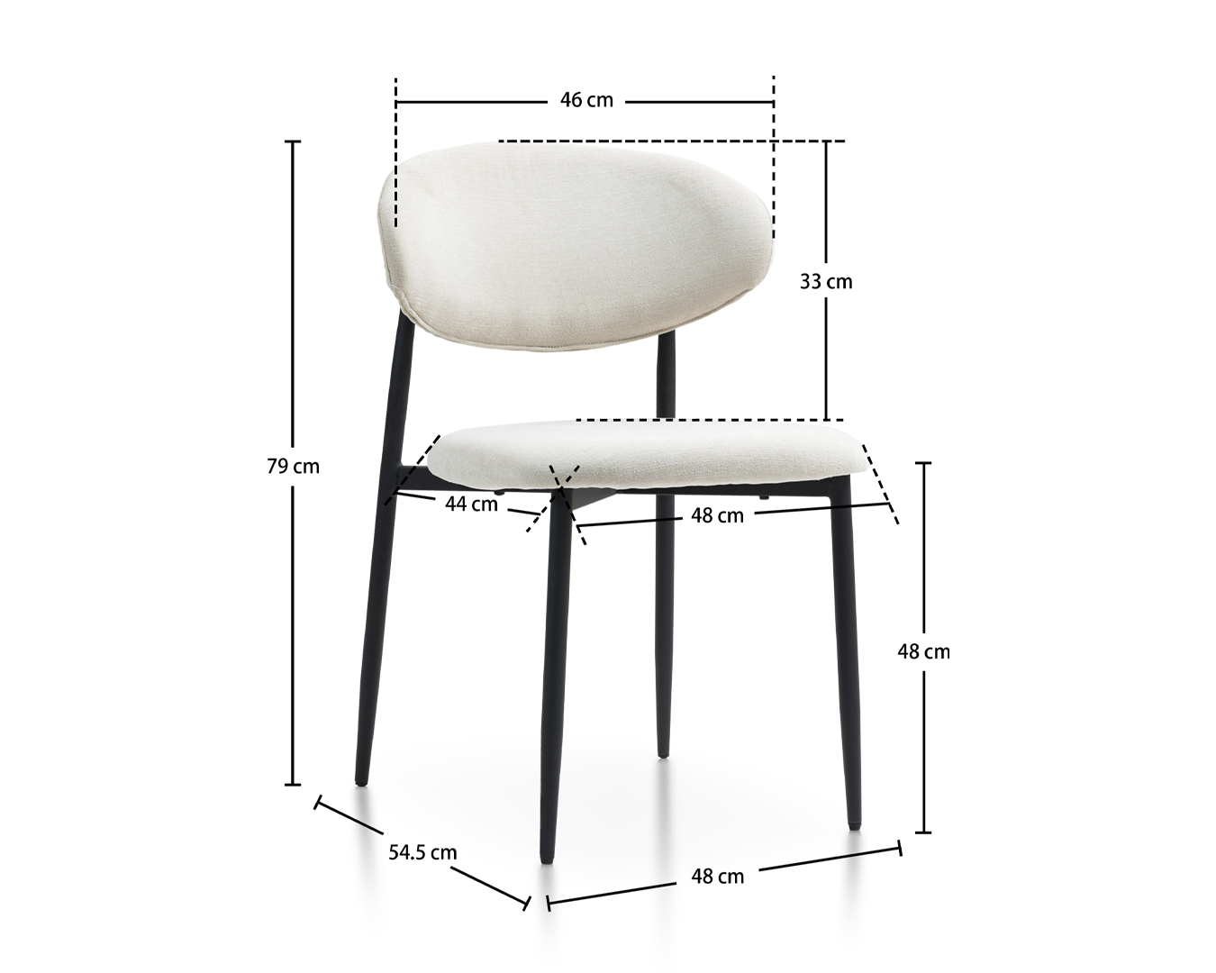 • そのデザインは、クラシックなエレガンスとモダンなシンプルさをシームレスにブレンドします。シートとバックレストは、豪華なベージュの生地で布張りされており、温かく魅力的な外観を提供します。洗練されたブラックメタルフレームに支えられて、椅子は頑丈さと耐久性の感覚を醸し出しています。背もたれは穏やかな曲線で設計されており、比類のない快適さとサポートを提供します。
