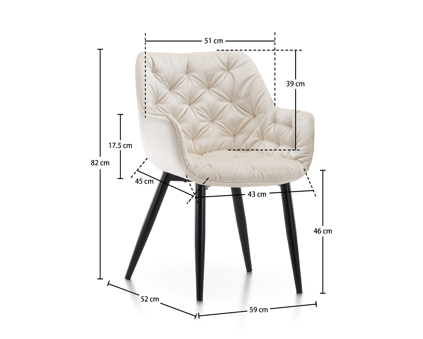 • ダイニングルーム、リビングルーム、さらには寝室の隅に置くかどうかにかかわらず、この椅子はエレガンスと快適さのタッチを追加します。黒い脚は強力な基盤と現代の美学を提供し、あらゆるインテリアで傑出した作品になります。